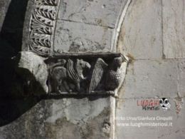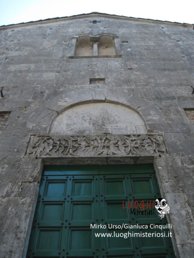 Sulla facciata è presente un architrave che contiene intrecci di vegetali e due figure maschili ai lati, dei quali quello di sinistra tiene in mano una roncola (opera di Biduino – XII secolo), mentre emergono dalle foglie piccoli mascheroni e qualche animale. Sulla facciata è inoltre presente solo una bifora che spezza la semplicità del muro esterno.