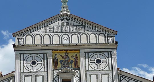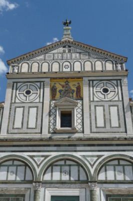 FIRENZE – SAN MINIATO AL MONTE / Altri elementi li possiamo osservare sulla bella facciata della Basilica come la presenza del “Vaso Sacro” forse un richiamo all’emblematica figura del Graal che ritroviamo nel Duomo di Siena