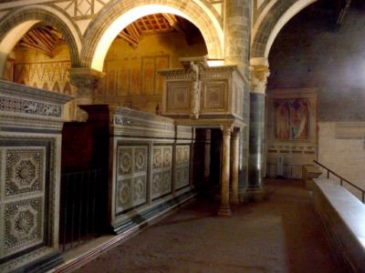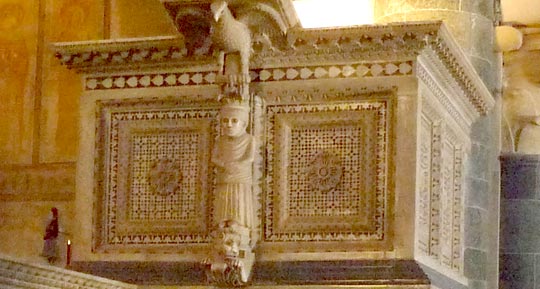 Altro problema interessante di interpretazione lo abbiamo con il pulpito che ci ricorda molto quello della Pieve di Gropina. Oltre a tutti i simboli geometrici che fanno della basilica un centro di studi esoterici, anche il pulpito è coronamento di tutta la bellezza artistica racchiusa in questo mirabile monumento, dove l’arte diventa simbolismo e mistero.