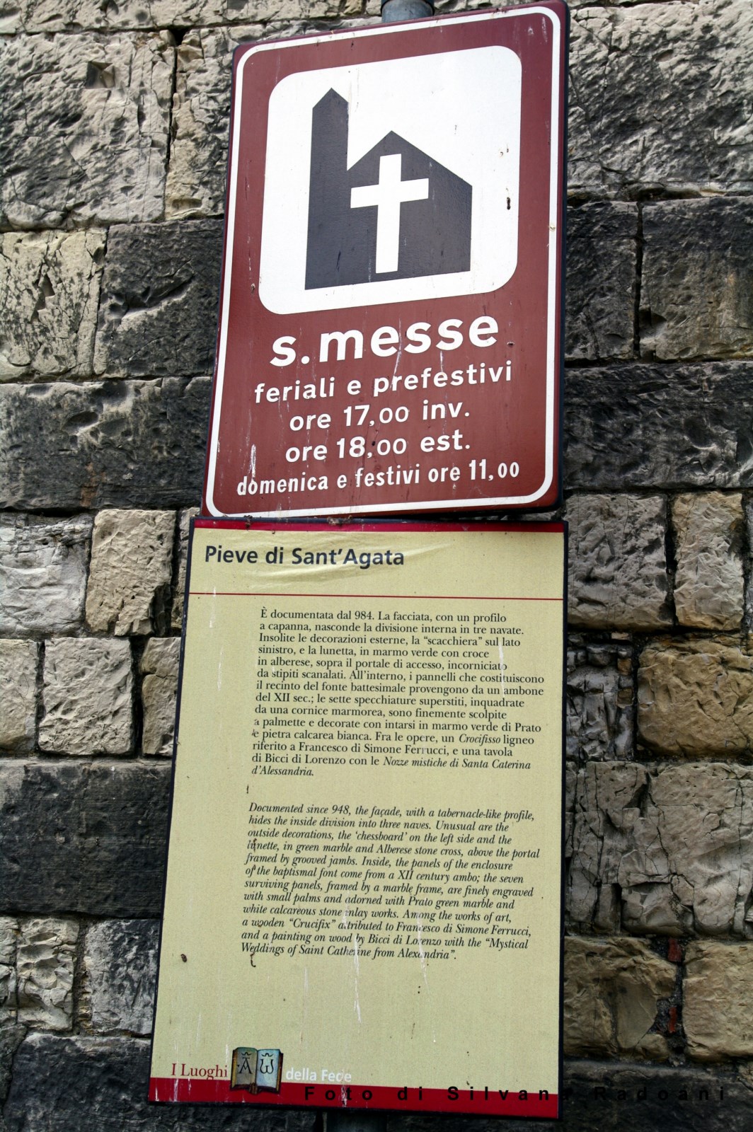 Chiesa di Sant’Agata – Sant’Agata frazione di Scarperia e San Pietro (FI) / E’ documentata dal 984. La facciata con un profilo a capanna, nasconde la divisione interna in tre navate. Insolite le decorazioni esterne, la “scacchiera” sul lato sinistro e la lunetta, in marmo verde con croce in alberese, sopra il portale di accesso, incorniciato da stipiti scanalati.